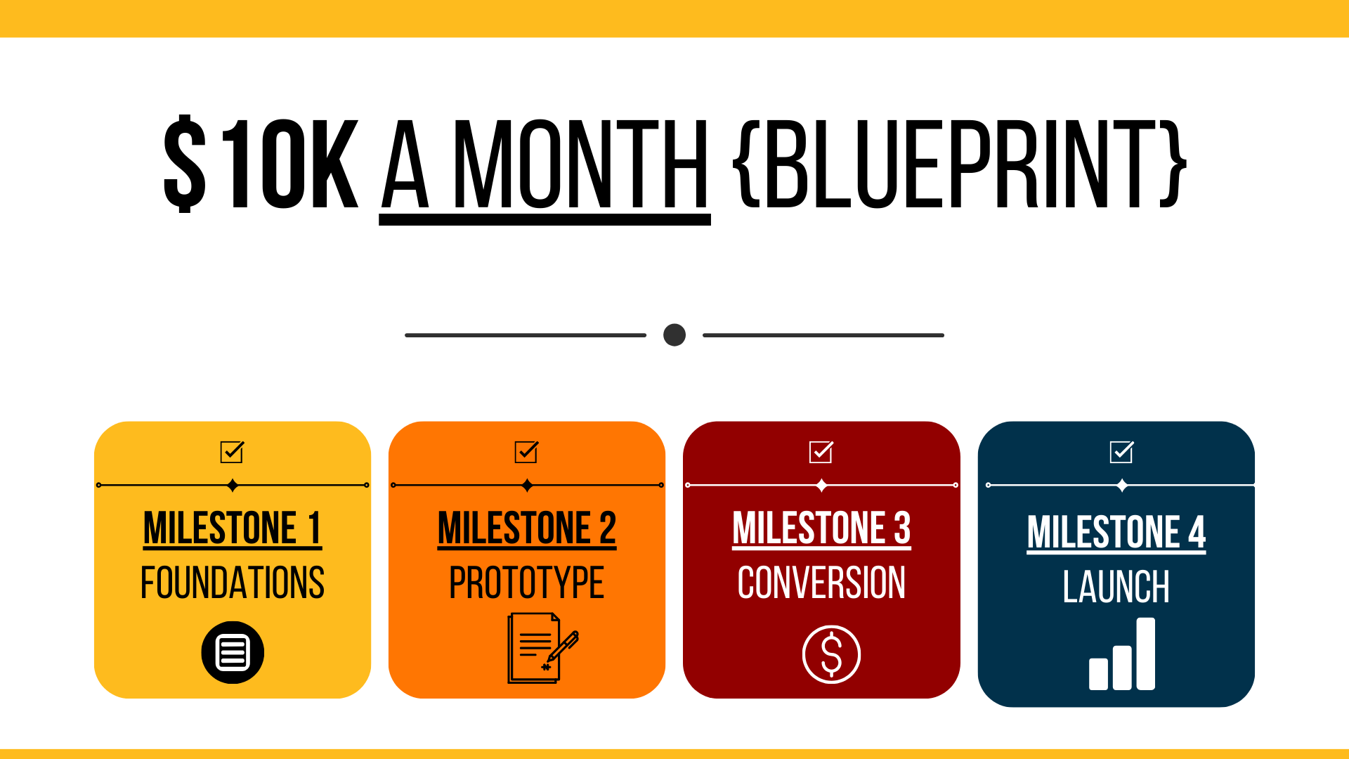 We call it "$10k A Month {Blueprint}" because that is what it is... a step-by-step method to get you to $10k a month in 90 days or less. The process includes four delicately designed milestones that you will reach as you follow the instructions.